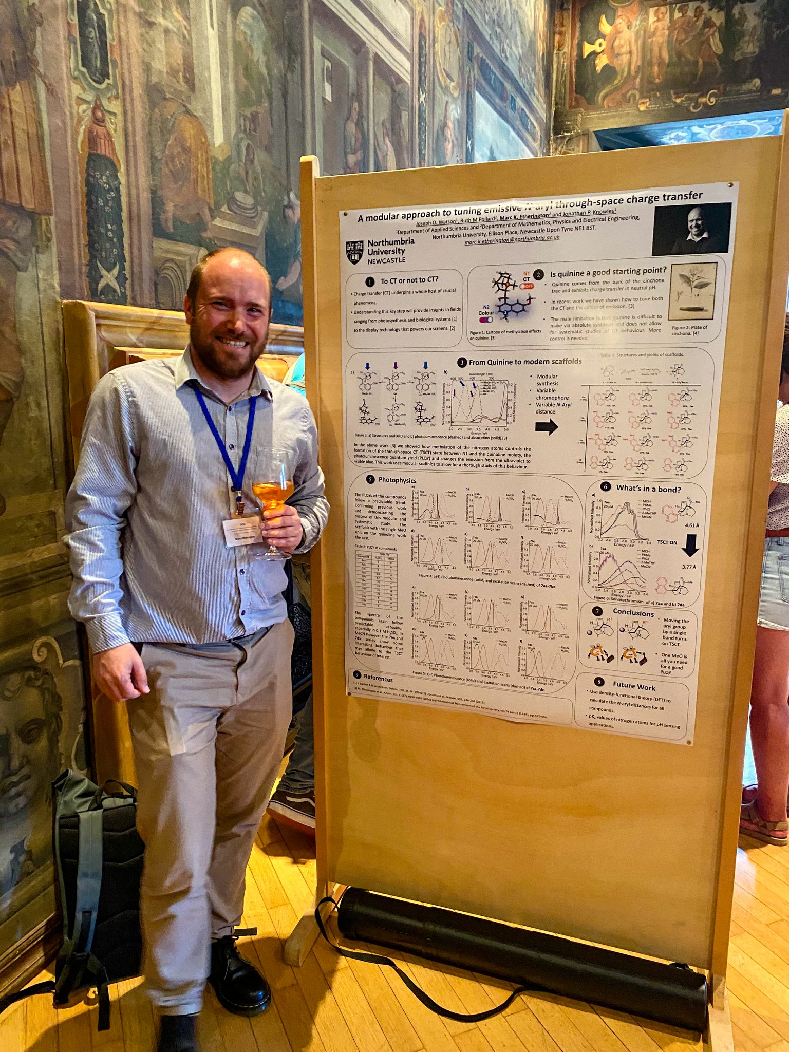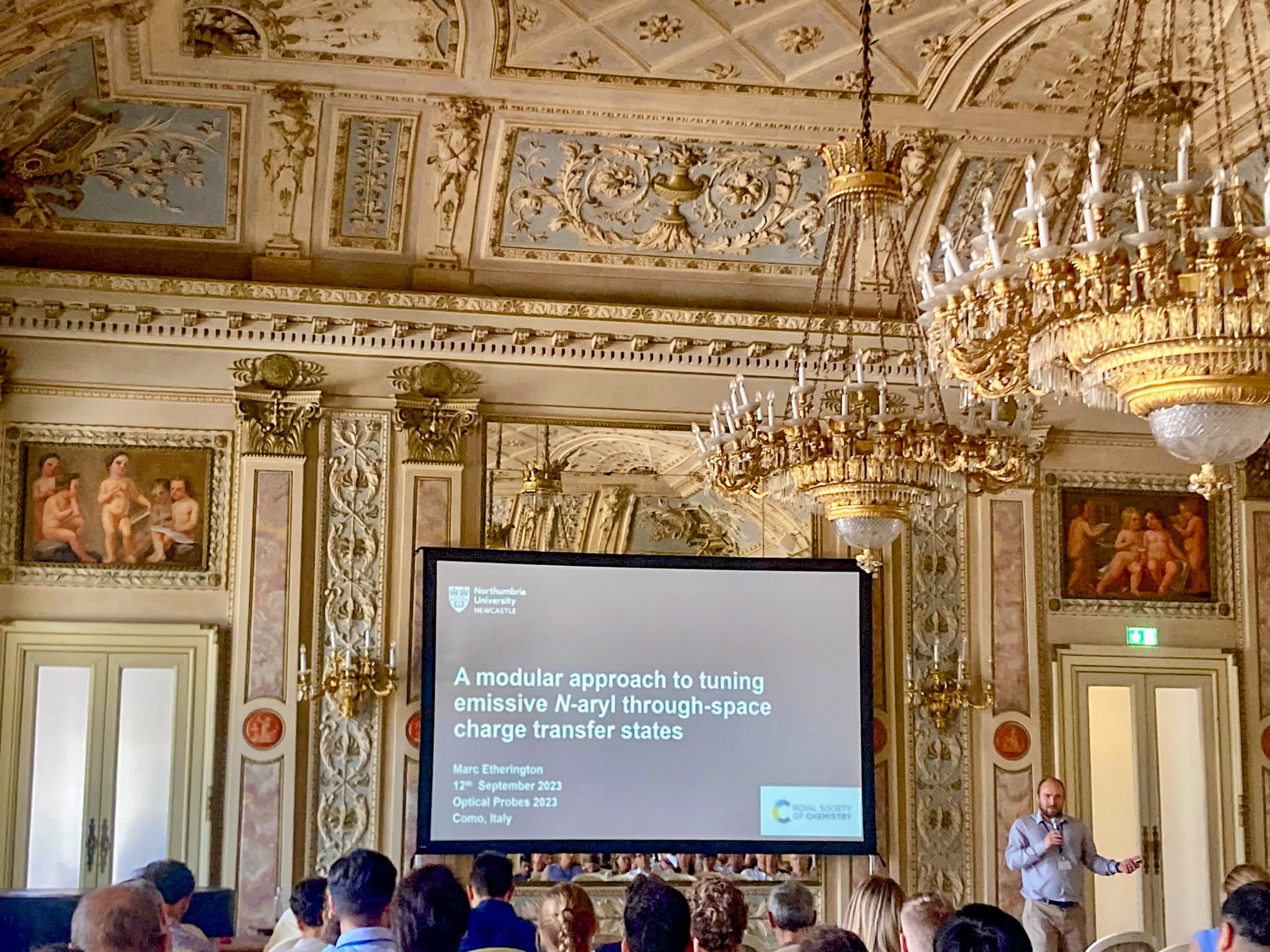 Publish date: 12 September 2023Marc has presented some of the group’s recent work on controlling charge transfer in caged quinoline systems as a flash talk and poster presentation at the international conference ‘Optical Probes 2023’. We have developed a modular synthetic pathways that gives fine control of the N-aryl distance and hence the charge transfer state formation. This gives fundamental insight into the processes as well as allowing control of emission colour. A great venue for some really inspiring talks from the spectroscopy community.
