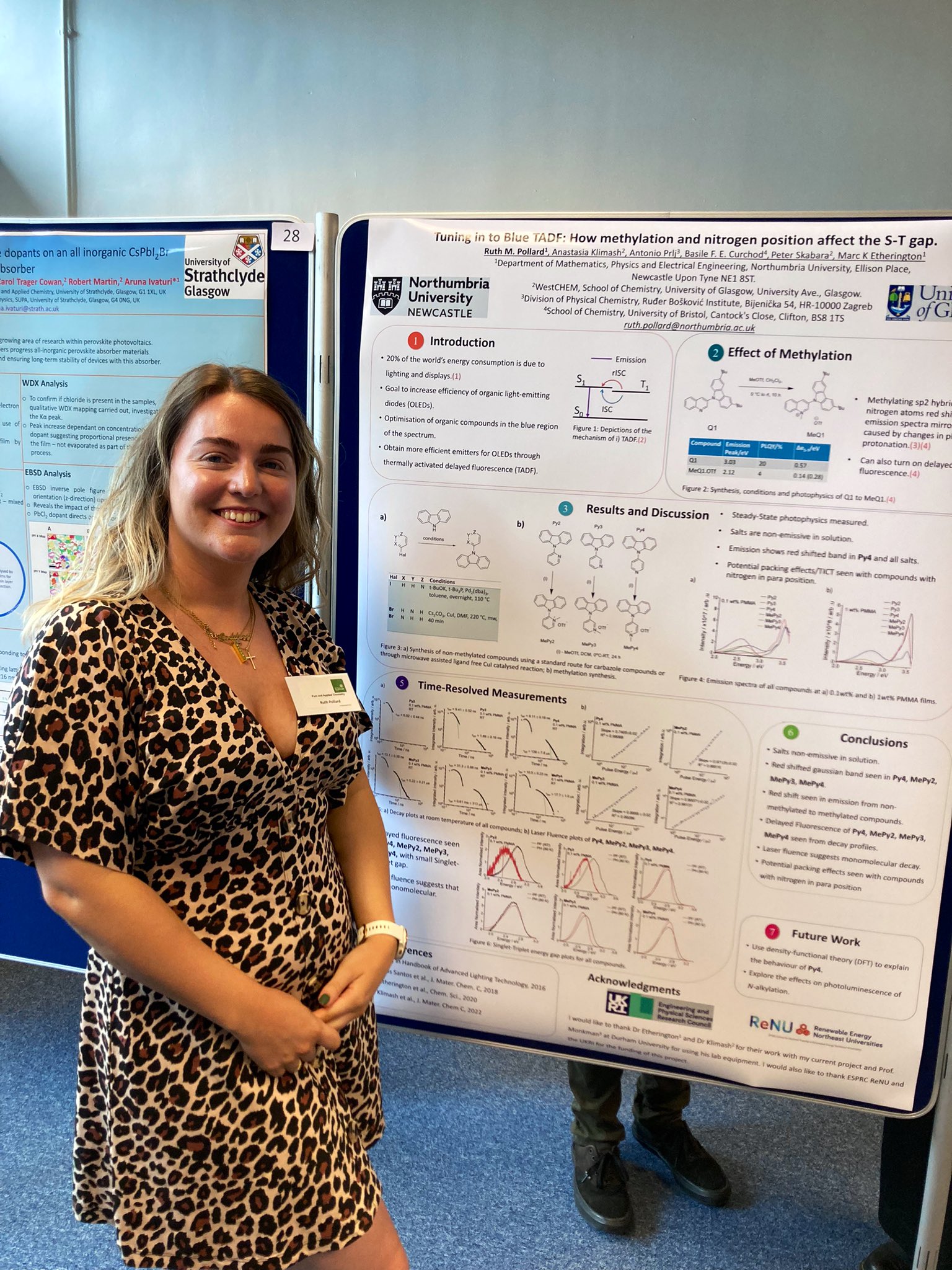 Publish date: 1 September 2023Ruth presented some of her work on the carbazole-pyridinium systems that we have been working on in collaboration with the University of Glasgow. She has demonstrated how the methylation of the nitrogen atom of the quinoline moiety can enhance the thermally activated delayed fluorescence properties of these compounds and still retain blue emission.